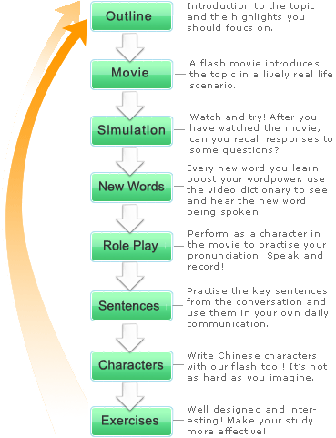 Every ChineseHour course includes a structured, step-by-step series of interactive course materials. Each on one interesting topic, our lessons use rich, interactive media to help you learn REAL Chinese in real-life situations. And the follow-up exercises employ a variety of learning techniques such as simulations, matching, role play, sentence production and character writing to help maintain your interest and enthusiasm in the learning process.