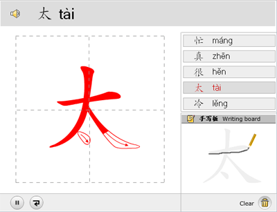 한자 쓰기: 이 모귤에서 “동영상 도구”를 이용하고 한자 쓰기를 가르칩니다. 각 한자가 쓰이는 순서를 칠판에다 써 주고 학습자는 본뜰 수 있습니다.도든 한자와 단어는 정선되고 대표적입니다.