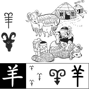 (  ) picture the frontal view of a sheep: two horns and a triangle towards the bottom representing the mouth. Later the triangle was divided into one vertical stroke and three horizontal strokes; and this is how we write the character today.
