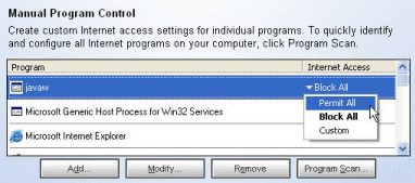 Under the "Programs" tab find the program "javaw", click the Internet Access that has been set for it (Block All) and select "Permit All".